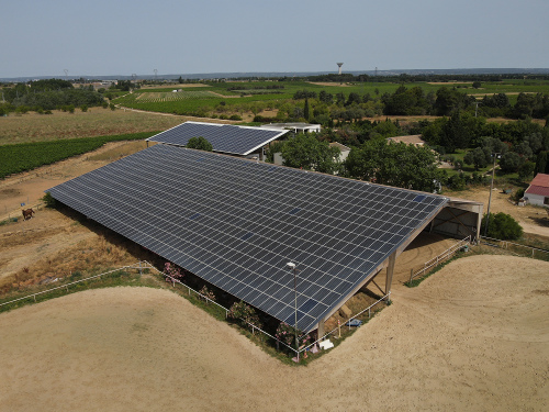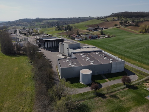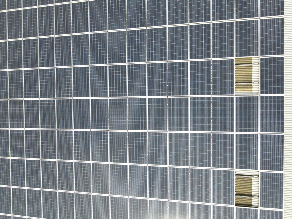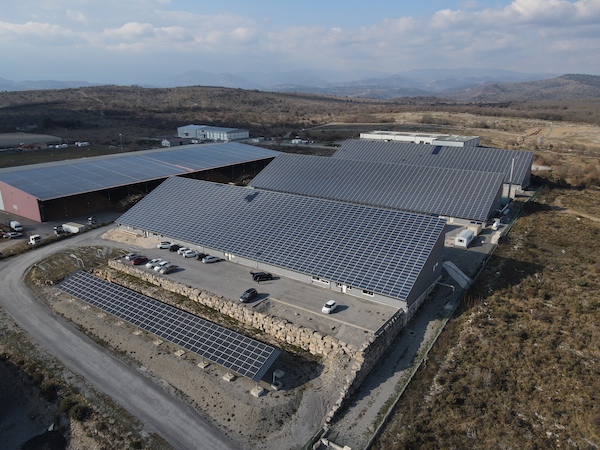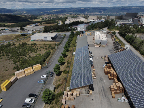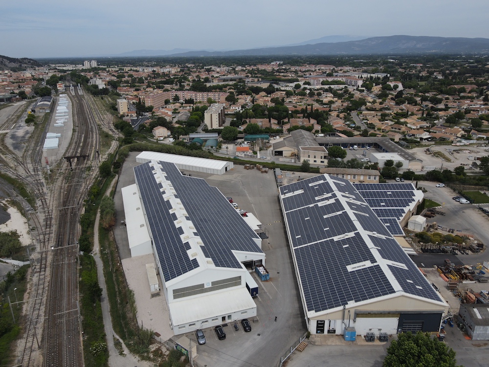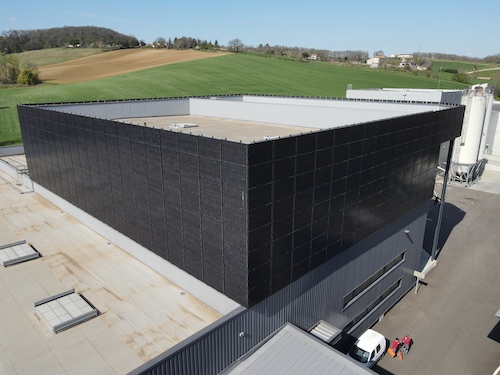 Ci-dessous le site industriel situé aux environs de Toulouse et ses panneaux photovoltaïque disposés sur trois façades du bâtiment