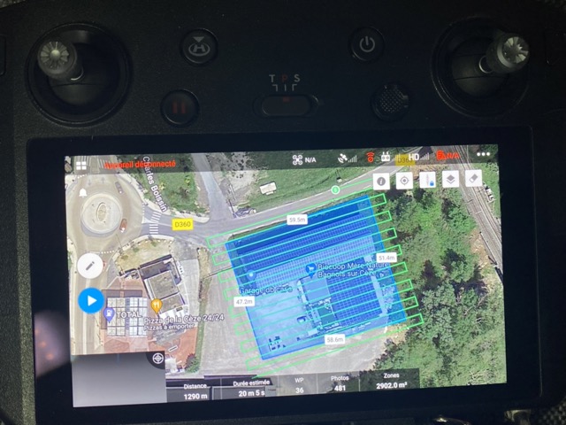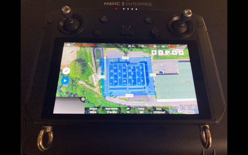 Ici le survol du site en vue visible. Le drone est programmé pour survoler le site avec sa caméra thermique afin de générer une carte thermique des panneaux. La finalité est de repérer les éventuelles défaillances de l’installation âgée d’une dizaine d’années.