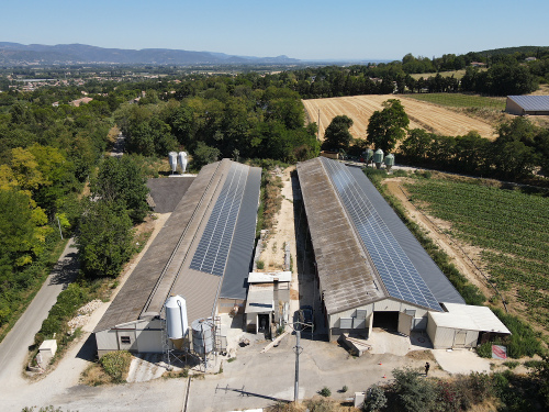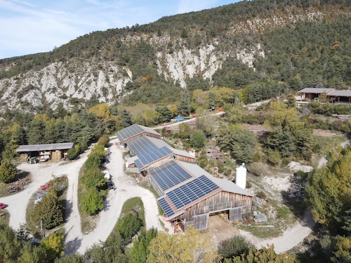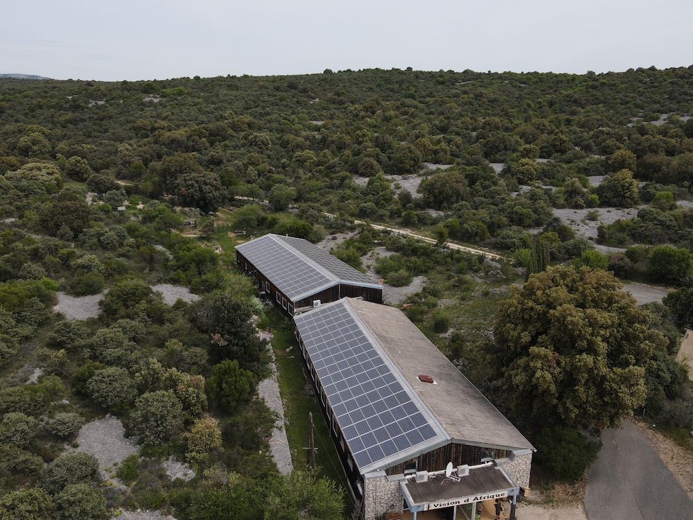 Notre drone et sa caméra thermique en vol sur un site de Bellegarde en Diois pour réaliser une carte thermique du bâtiment accueillant des panneaux photovoltaïques.
