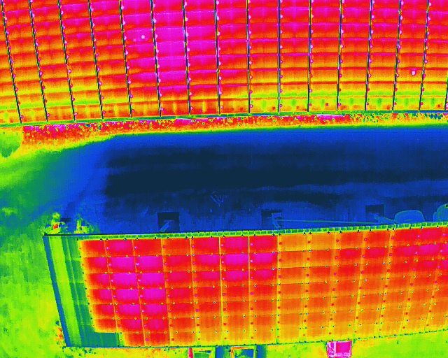 ici un exemple pour une centrale photovoltaïque (le doc original présente une précision de 2 cm/pixel) pour aider à la compréhension de défaillances des panneaux photovoltaïques