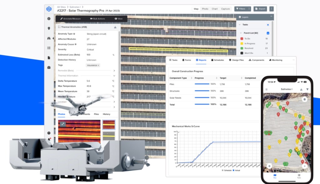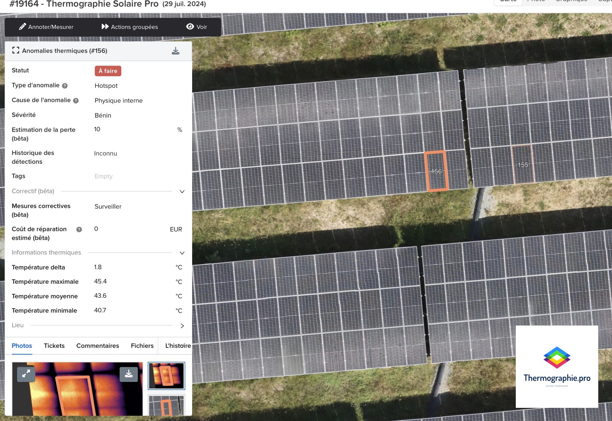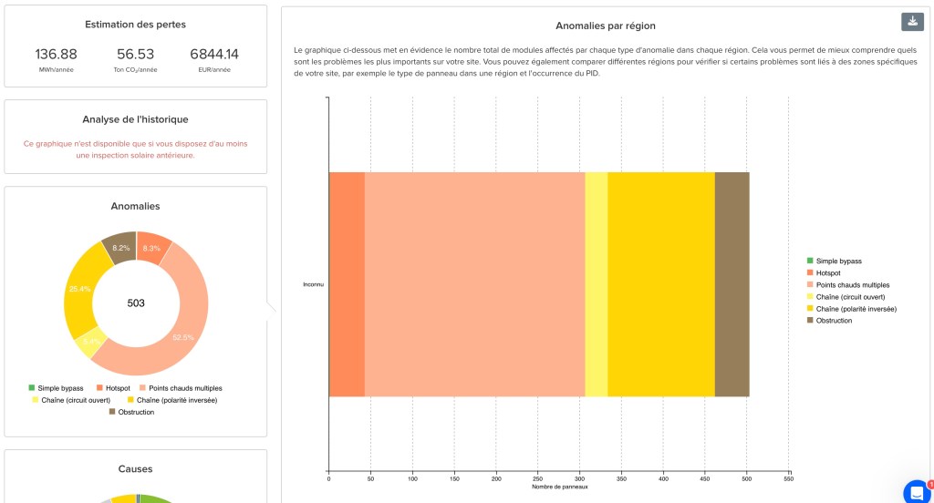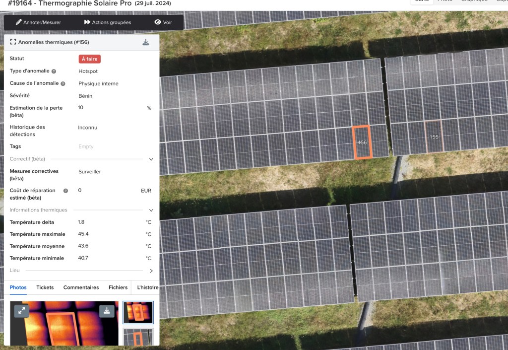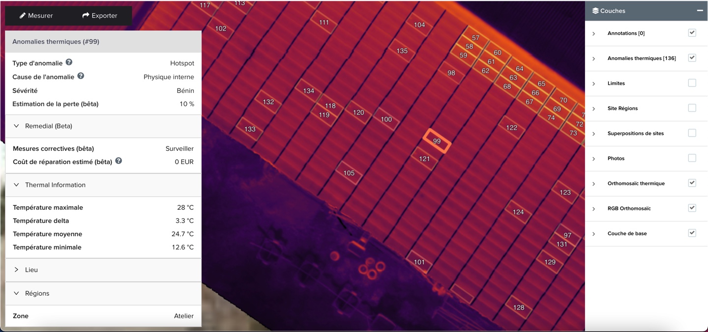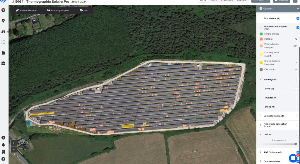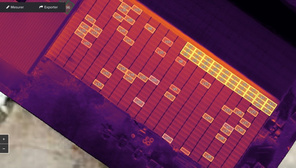 Les anomalies détectées (points chauds, chaînes défectueuses, ombrages, etc.) sont ensuite géolocalisées avec précision sur une carte interactive.