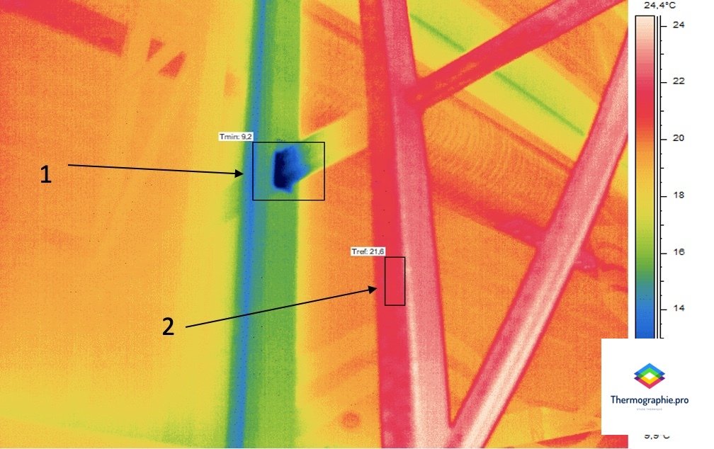 Ci-dessous un exemple d’une faiblesse mis en évidence par notre caméra thermique montée sur notre drone et analysée avec le logiciel dédié. On peut noter les différences de température évidentes sur différents points structurels du bâtiment. La signature thermique pointe un pont thermique en (1).